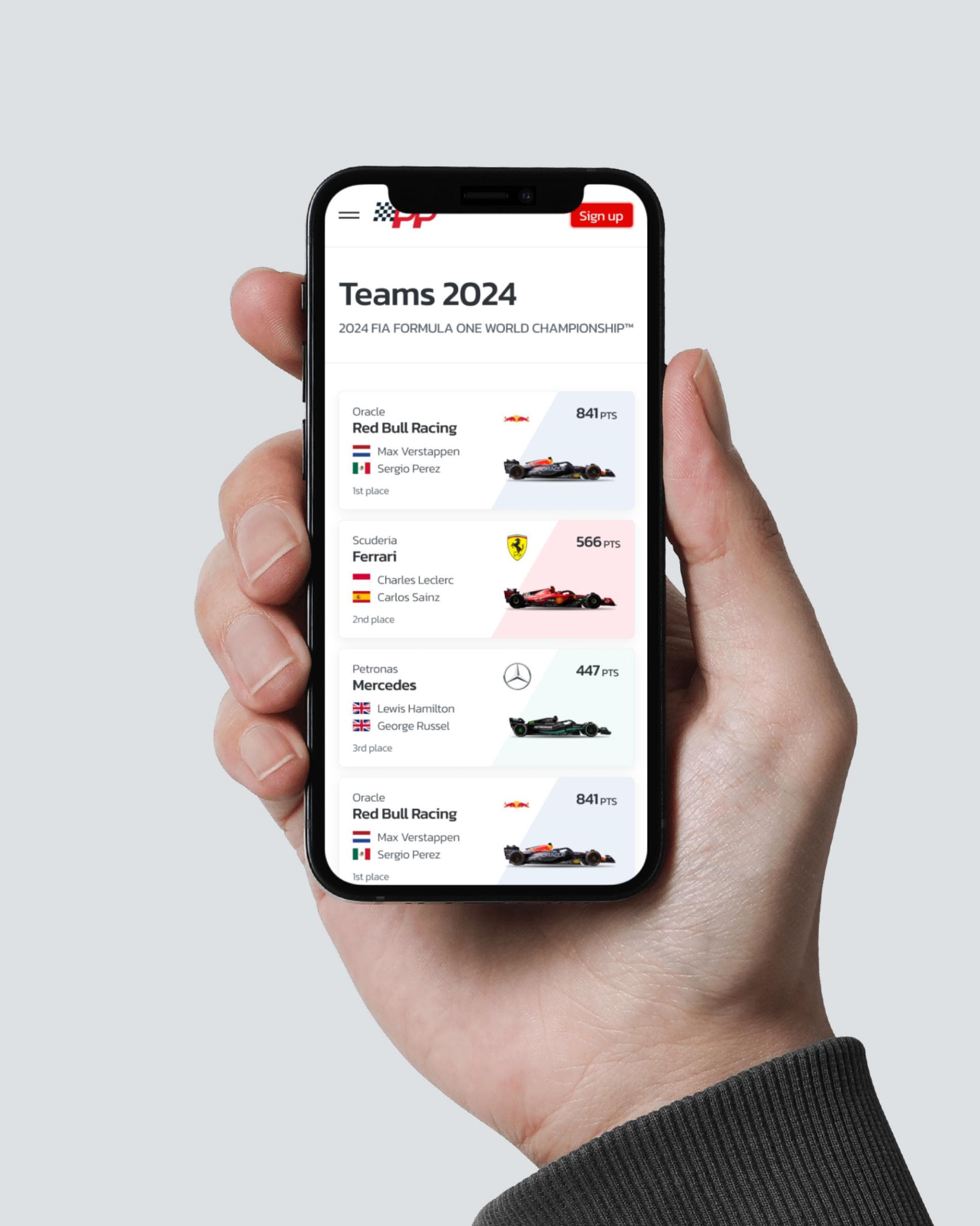 With the system in place, I moved to the polished UI. Here I pushed for a modern but minimal look: bold headlines, clear data displays, and a balanced color scheme that fits the F1 vibe.